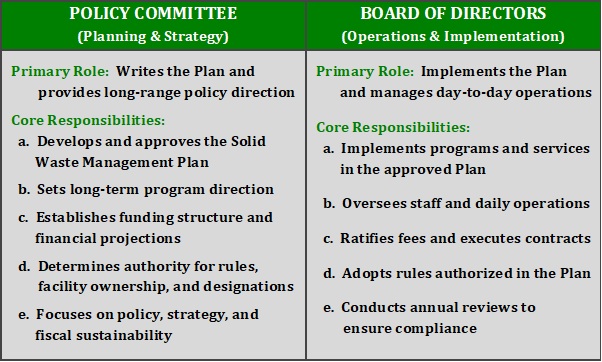 Governance Structure – Roles and Responsibilities The Clinton County Solid Waste Management District is comprised of two governing bodies: the Solid Waste Policy Committee and the Board of Directors. The seven member Policy Committee serves as the planning and policy-setting body, with the primary responsibility of writing and obtaining an approved solid waste plan. The three County Commissioners comprise the Board of Directors and serve as the operational and implementation authority. The Policy Committee sets the direction and the Board delivers the results. Together, they ensure strategic direction and operational accountability. |